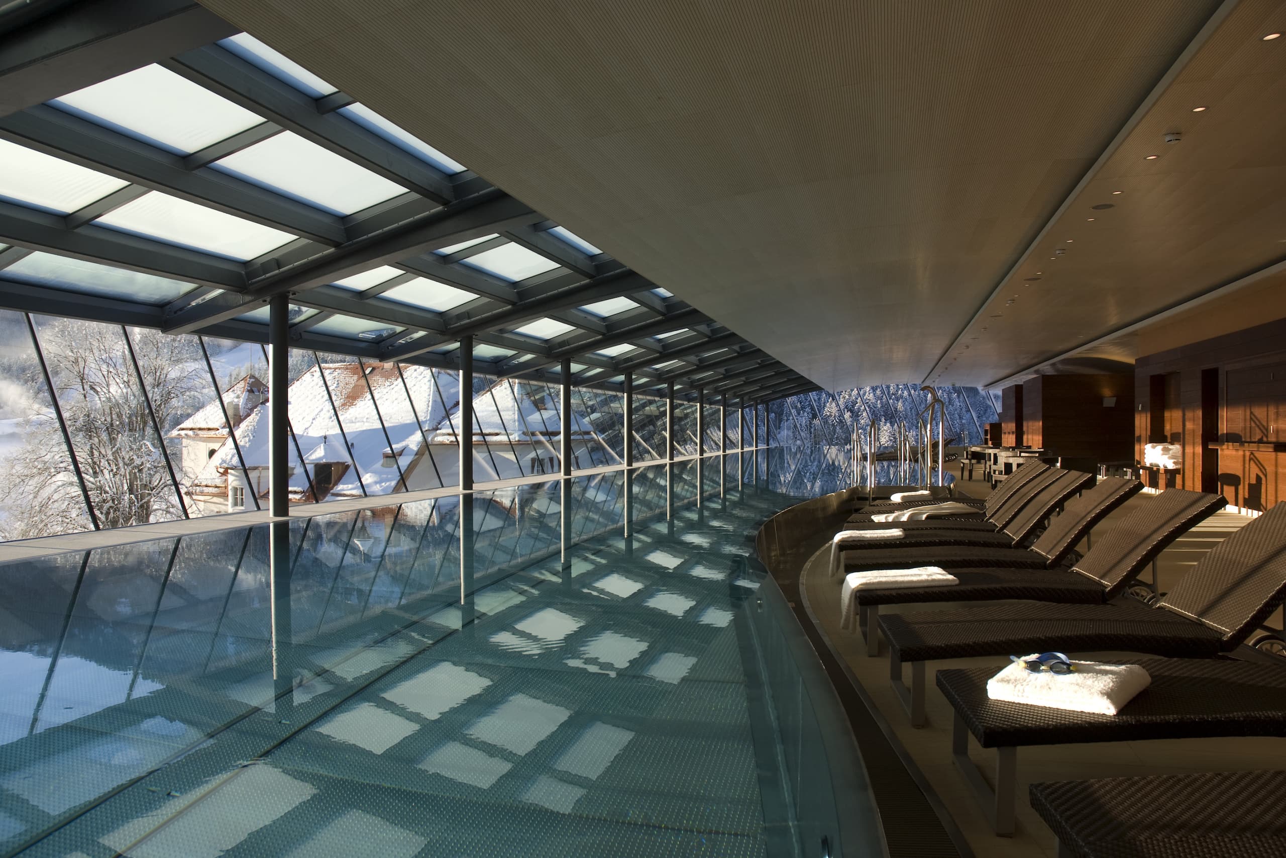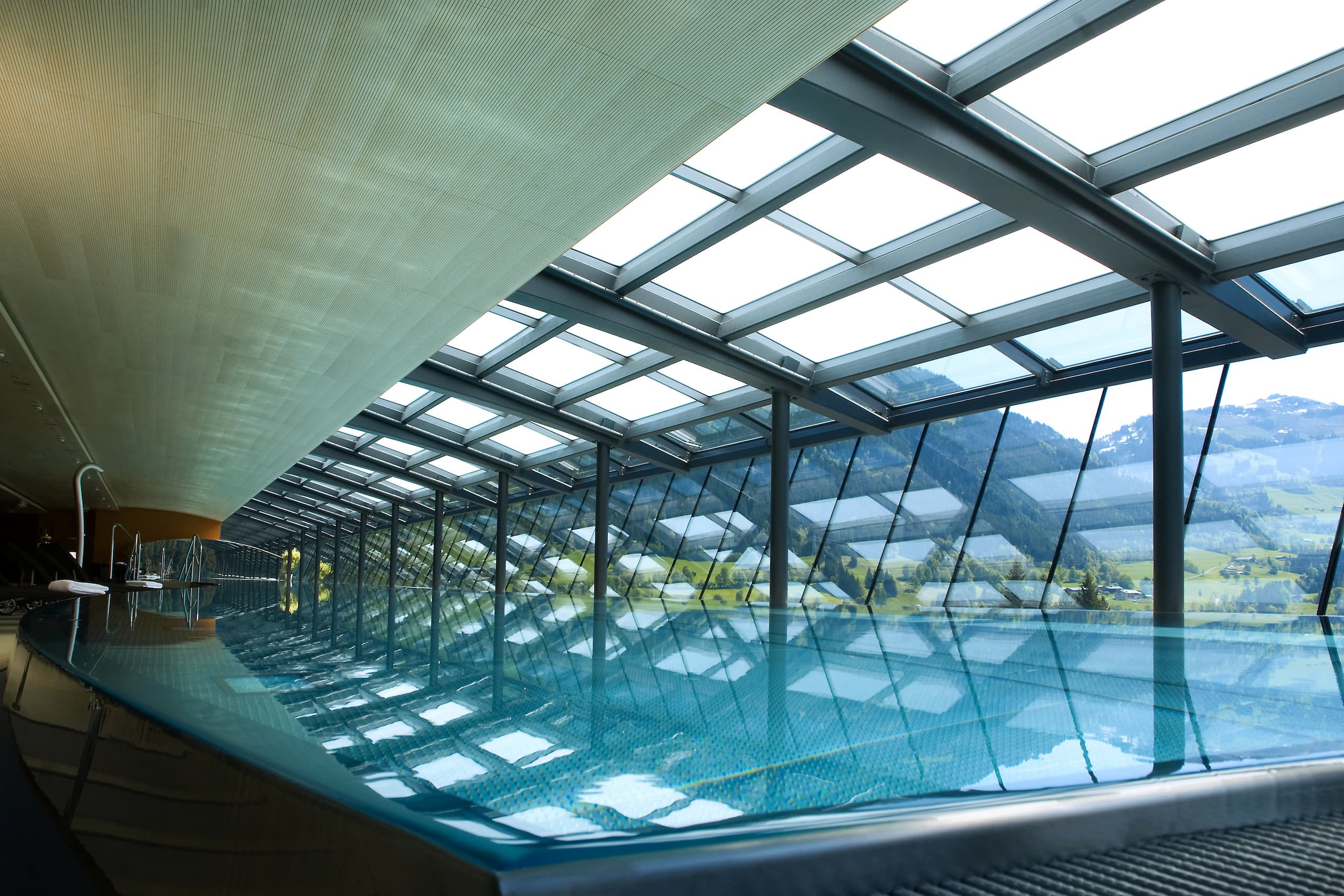 Hotelový střešní bazén s infinity proskleným přelivným žlábkem